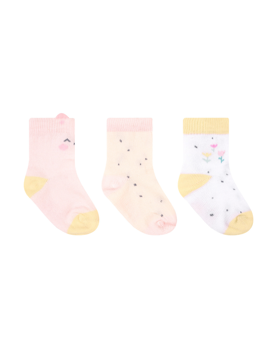 • Комплект от 3 чифта меки бебешки чорапки със стилен дизайн в нежни цветове;
