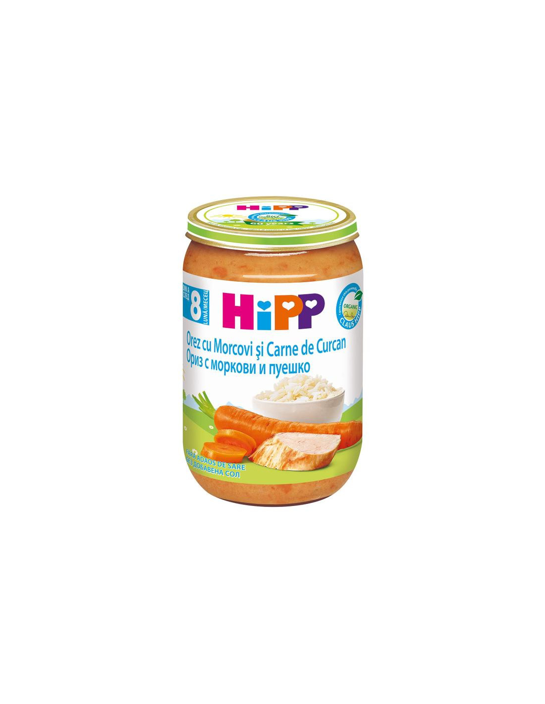 Биологичният знак на HiPP гарантира най-високо качество и надминава законовите изисквания за био земеделие. Основните съставки са ориз и пуешко, с фини парченца за приучаване към дъвчене. БЕЗ добавена сол / ниско ниво на натрий. БЕЗ мляко. БЕЗ глутен.